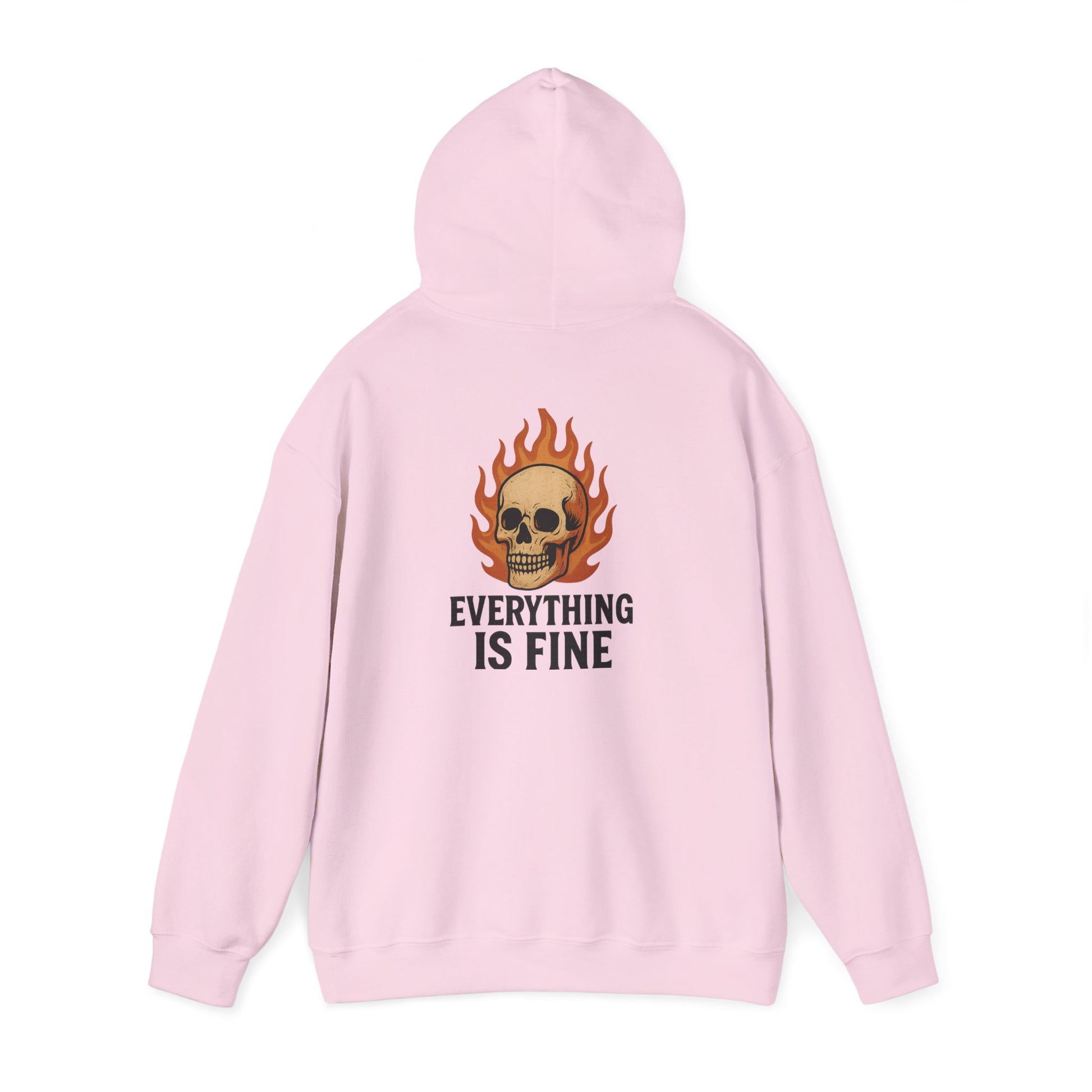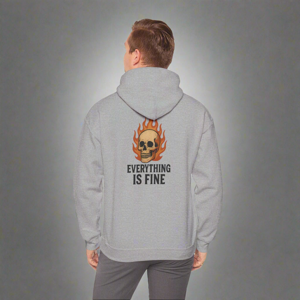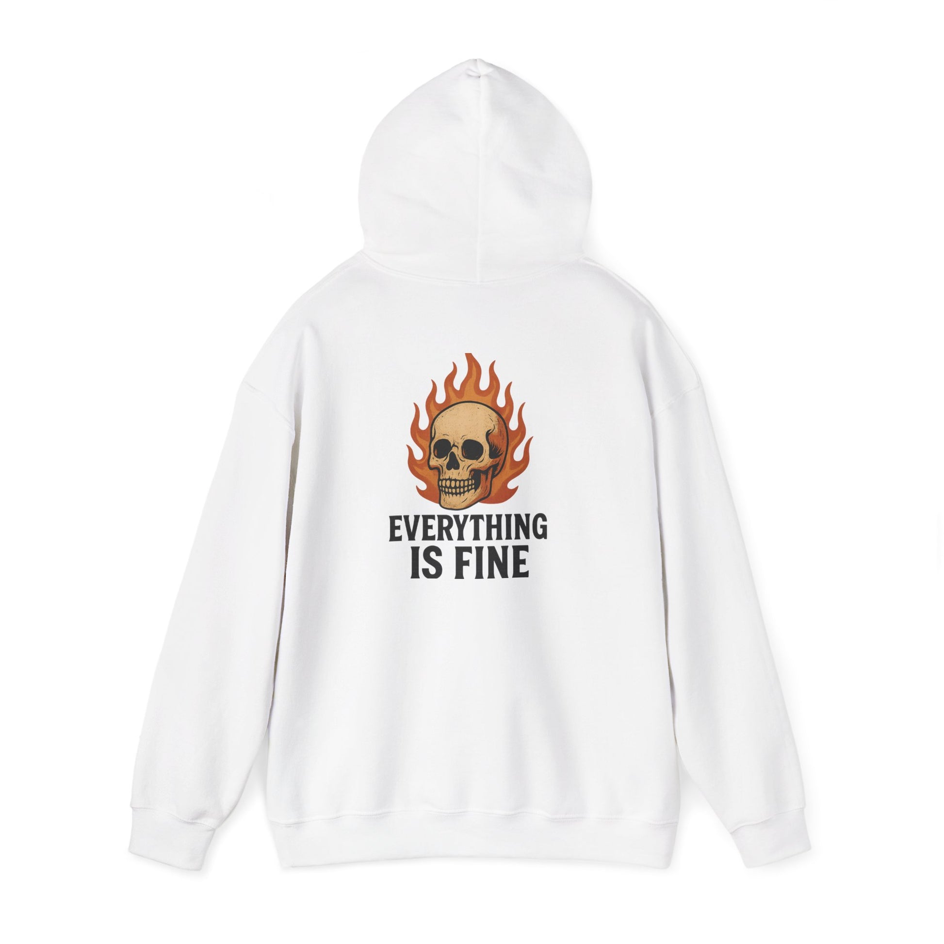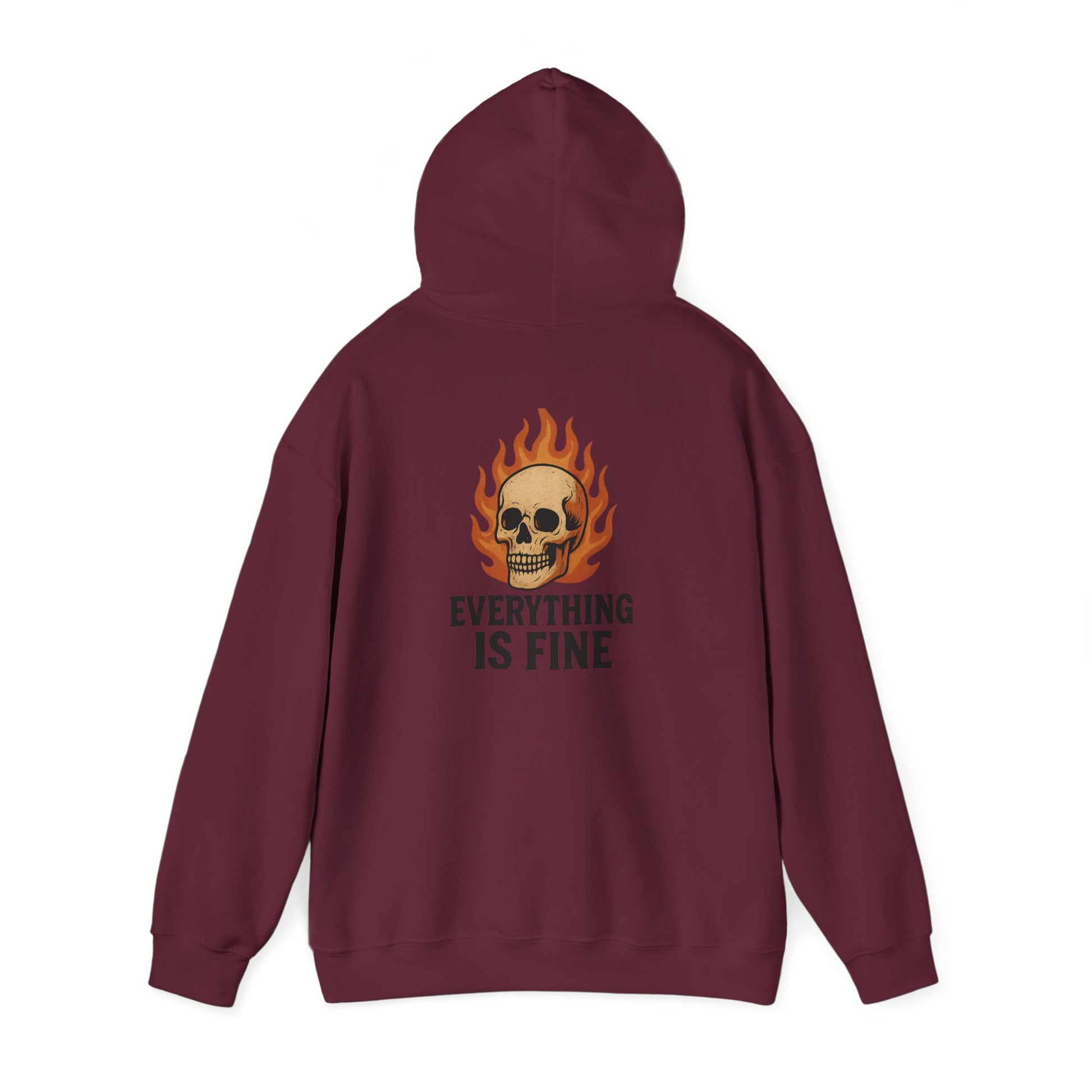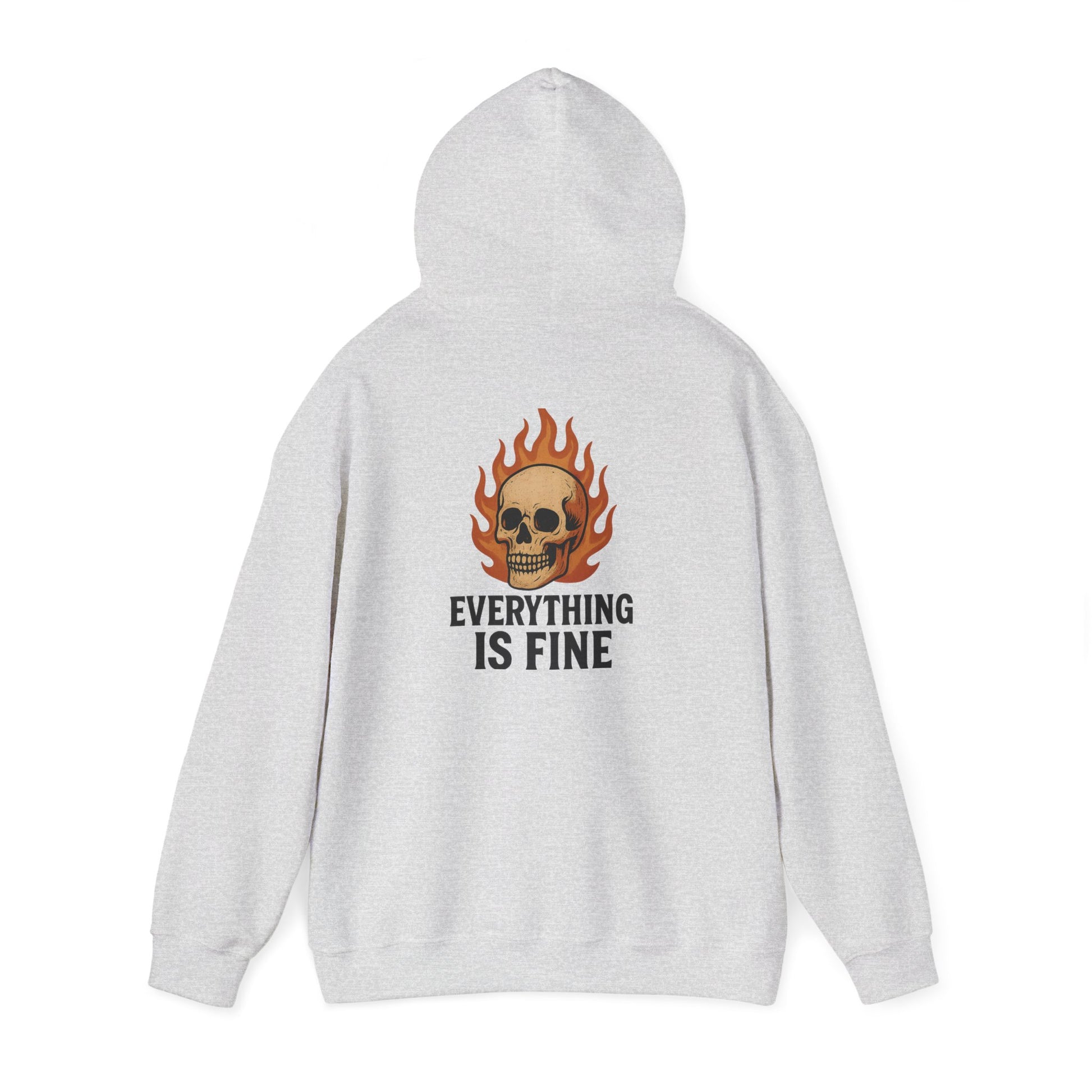 A cozy and stylish everything is fine skull hoodie perfect for those looking for a casual and edgy vibe. It is relevant for those who enjoy unique and bold designs, suitable for everyday wear or as a statement piece during Halloween.