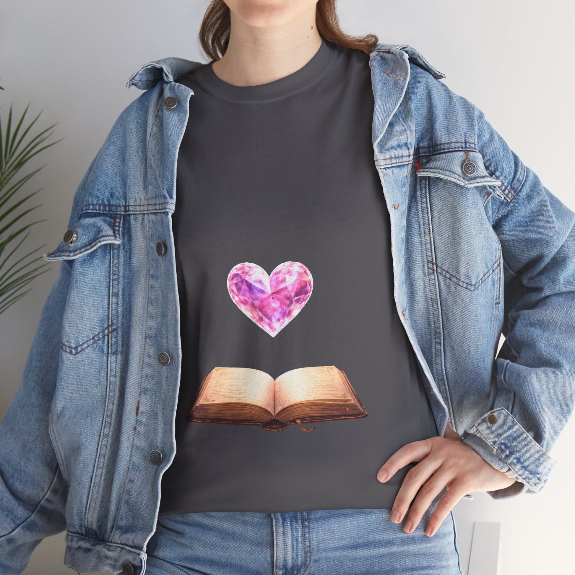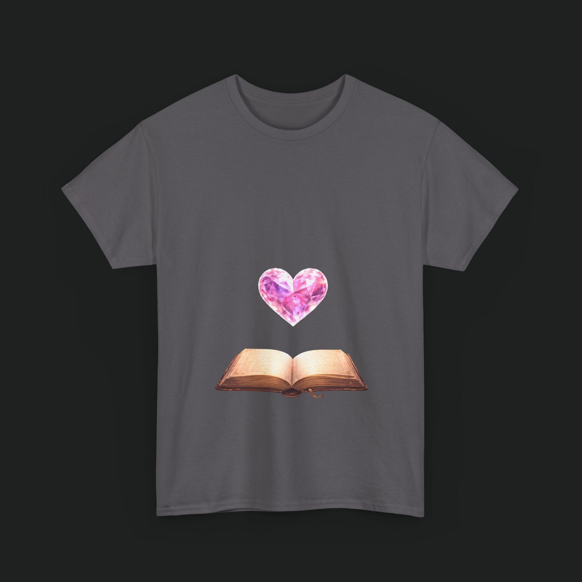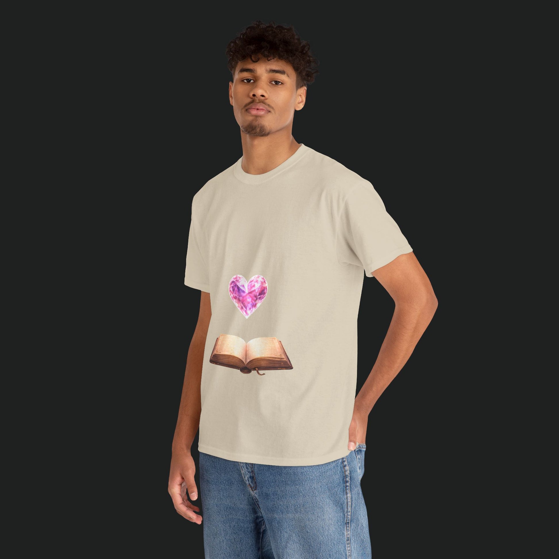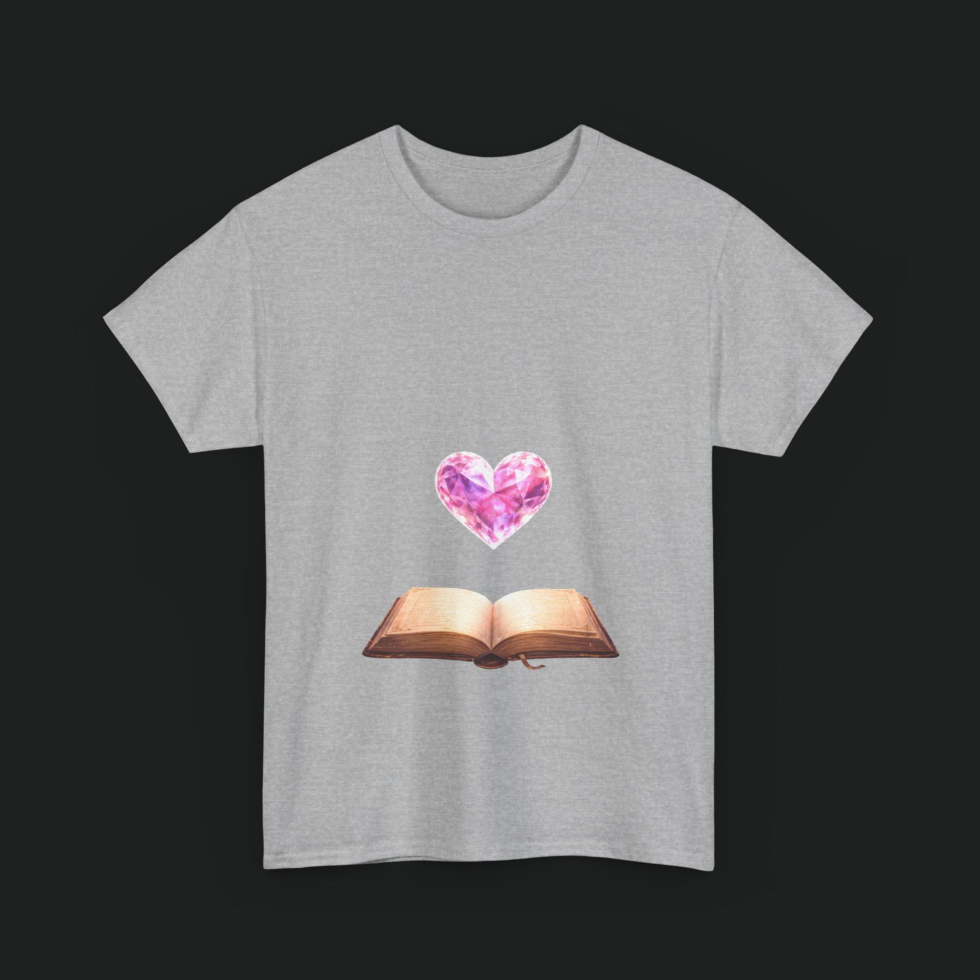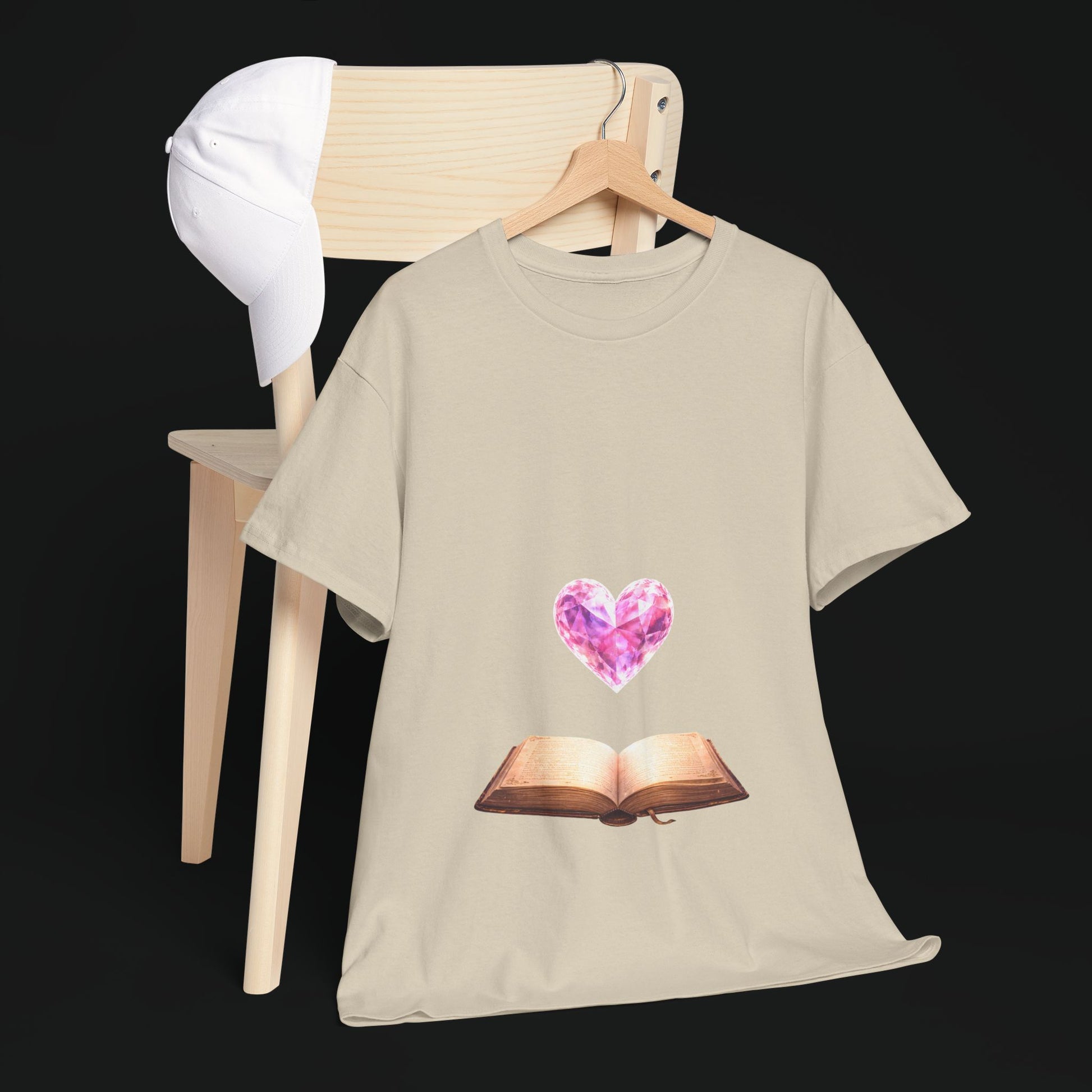 Soft, simple, and quietly expressive — this classic tee pairs a gently worn open book illustration with a watercolor heart floating above it. It’s a wearable nod to late-night reading, coffee-stained margins, and the small rituals that make stories feel like home. The relaxed crew neck and medium-weight cotton drape comfortably whether you’re curled up on the couch, shelving new finds at a bookshop, or wearing it under a cardigan for a low-key event. Subtle details — like the tear-away label and stable shoulder tape — keep distractions away so the design and the moment stay front and center.