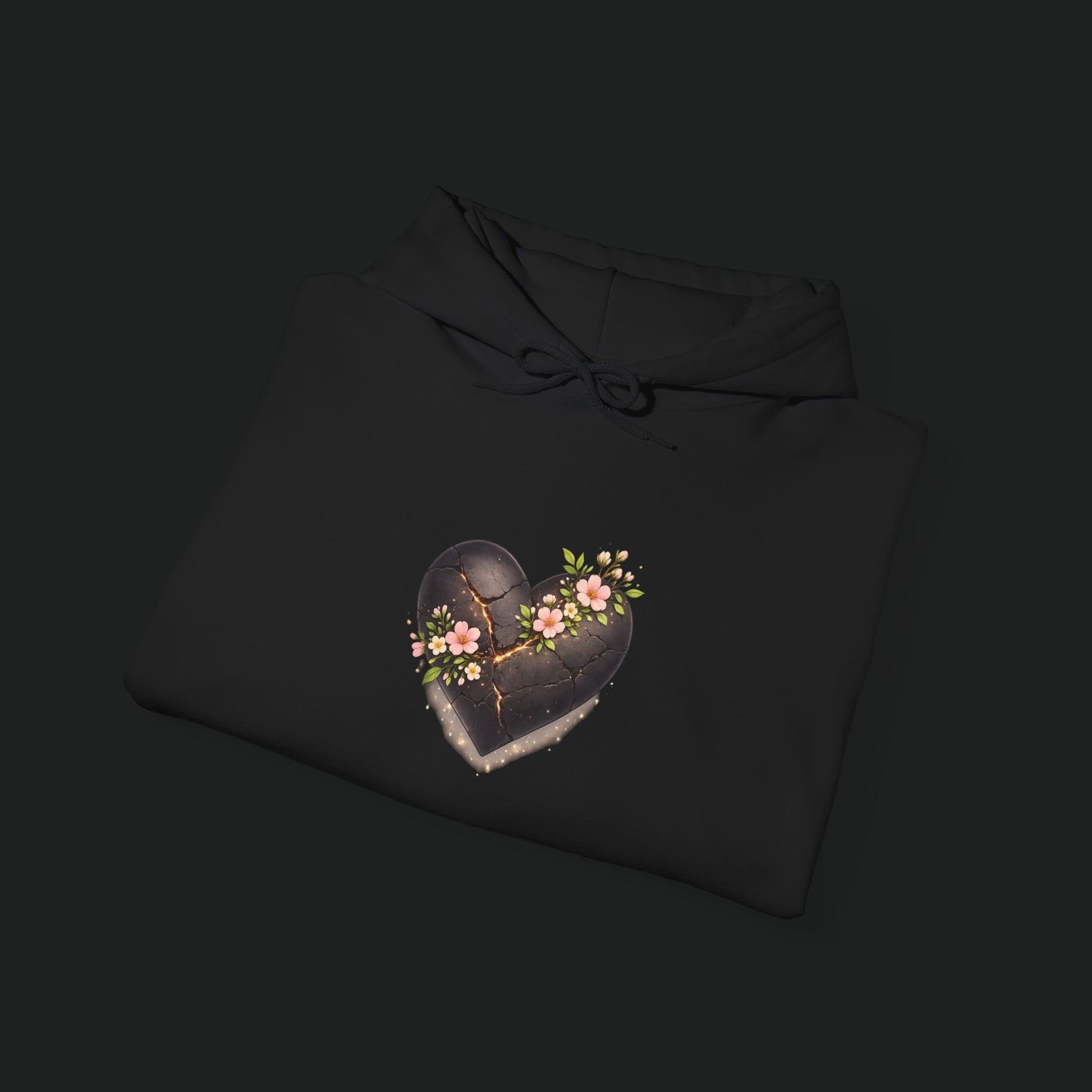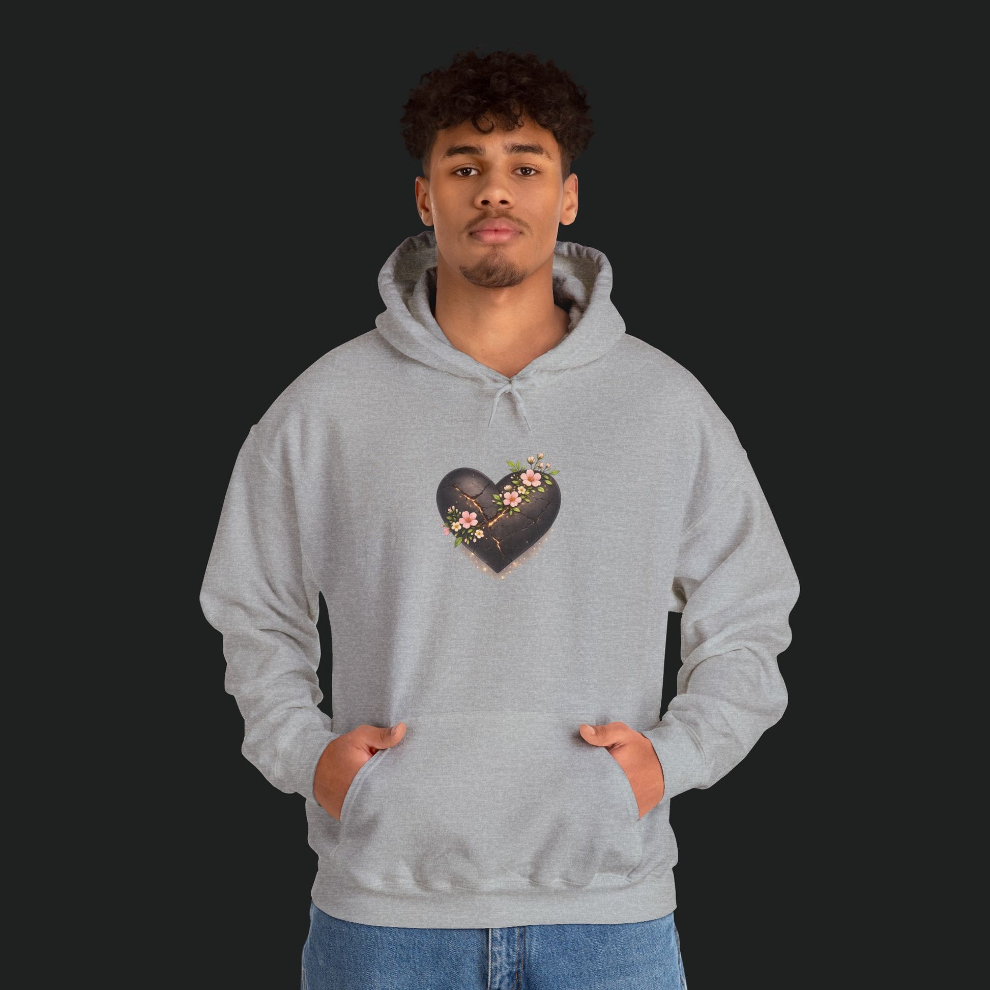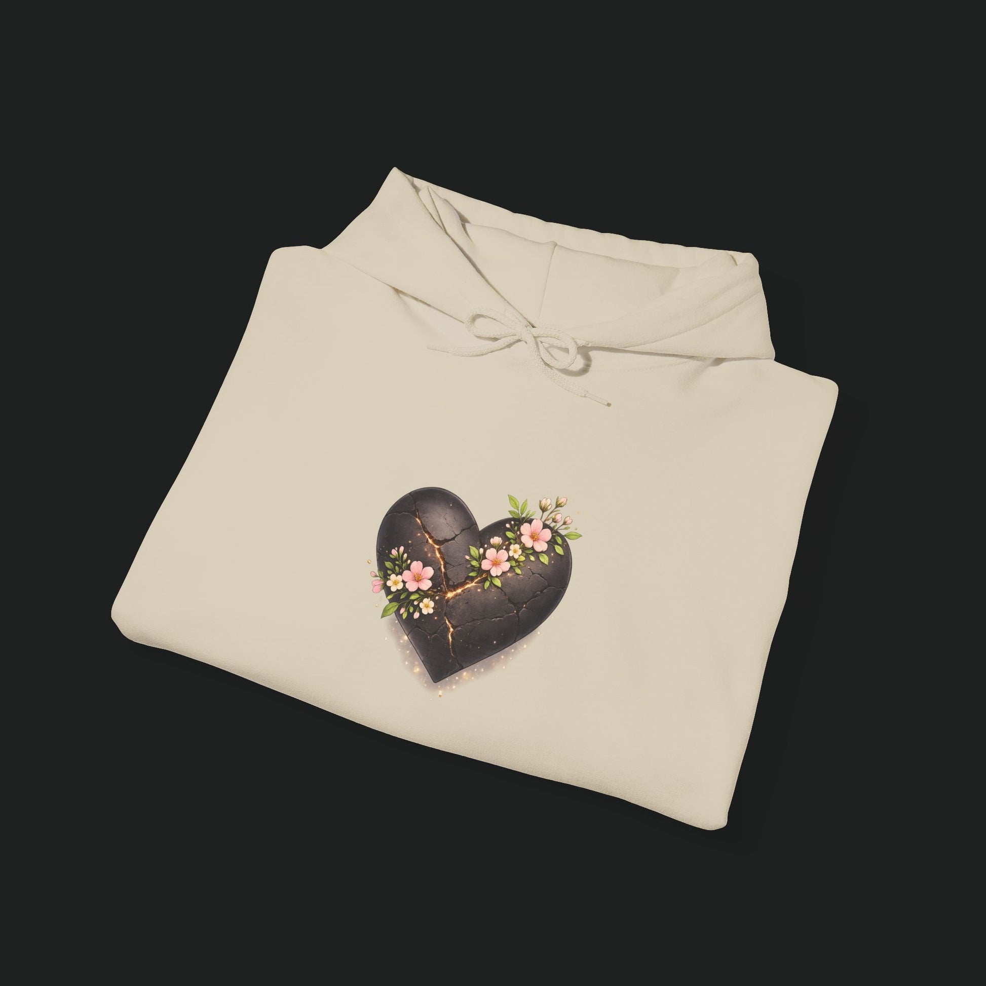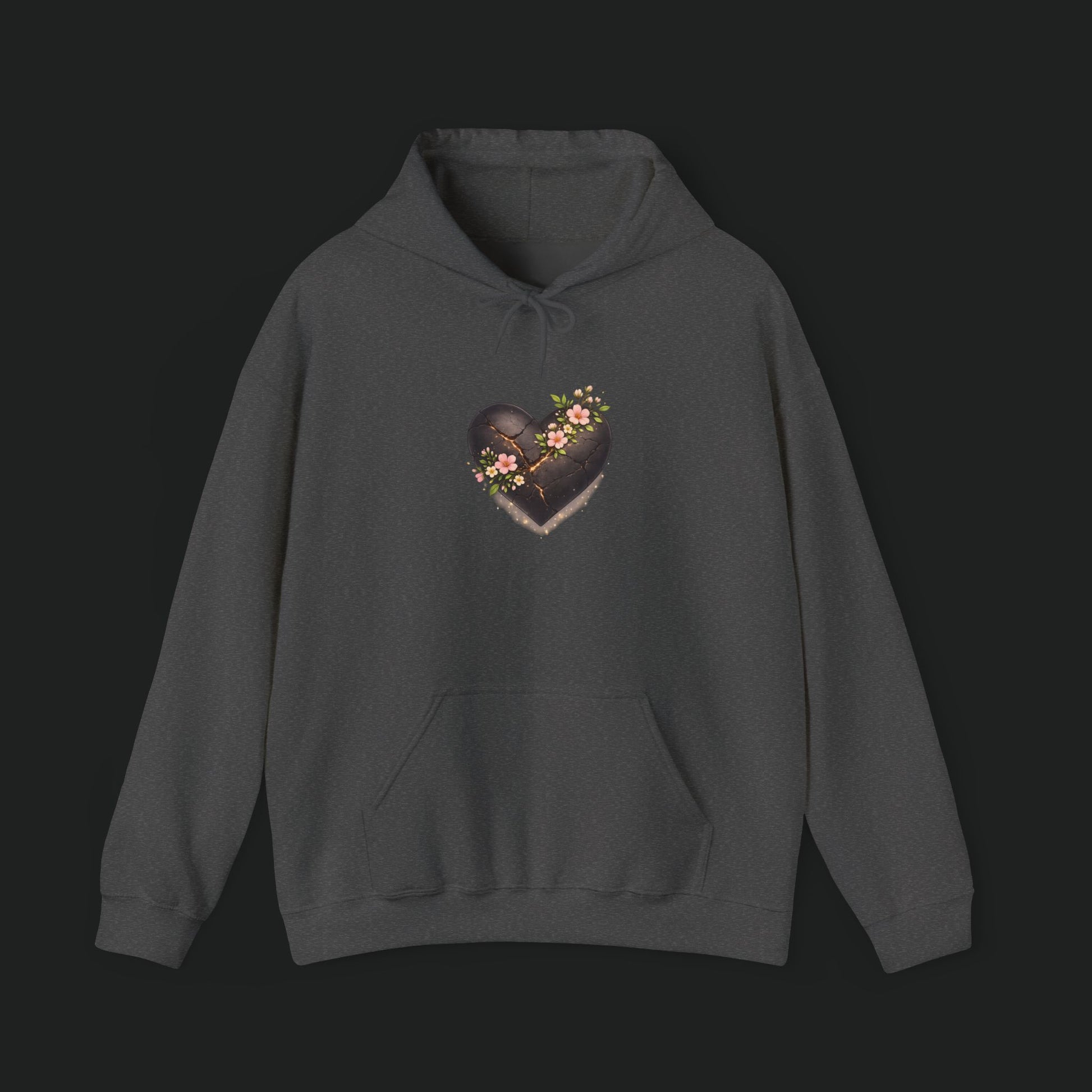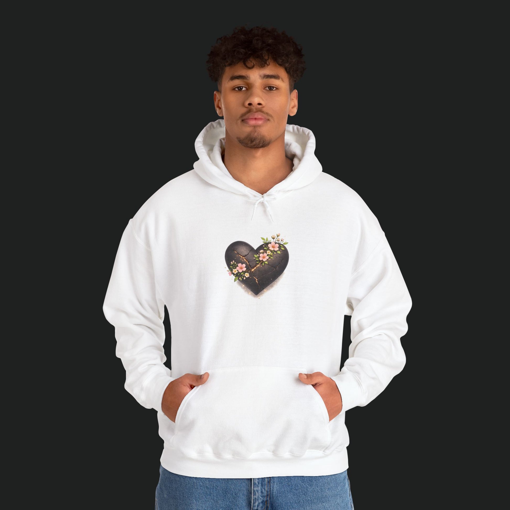 Soft, lived-in warmth wrapped around a quiet moment. This hoodie wears like a small sanctuary: roomy hood, deep kangaroo pocket, and a weighty cotton-poly blend that holds warmth without feeling bulky. A tender, slightly weathered heart motif rests on the chest—dark, textured, and threaded with tiny blossoms—bringing a gentle contrast to the clean white fabric. Slip it on after a long day to keep your hands warm, your shoulders relaxed, and a subtle piece of art close to your chest.