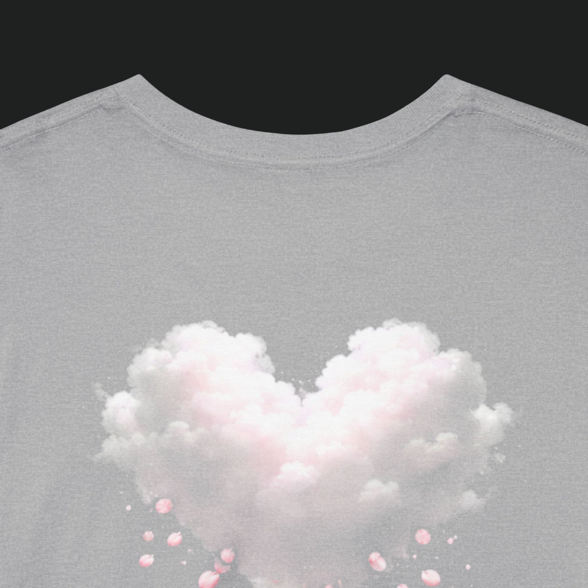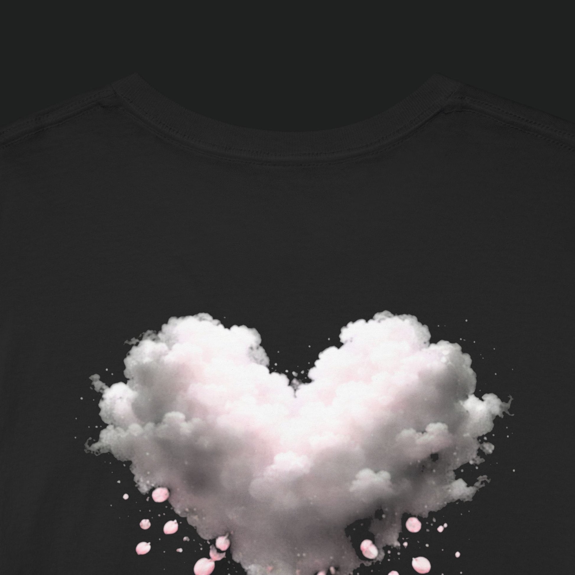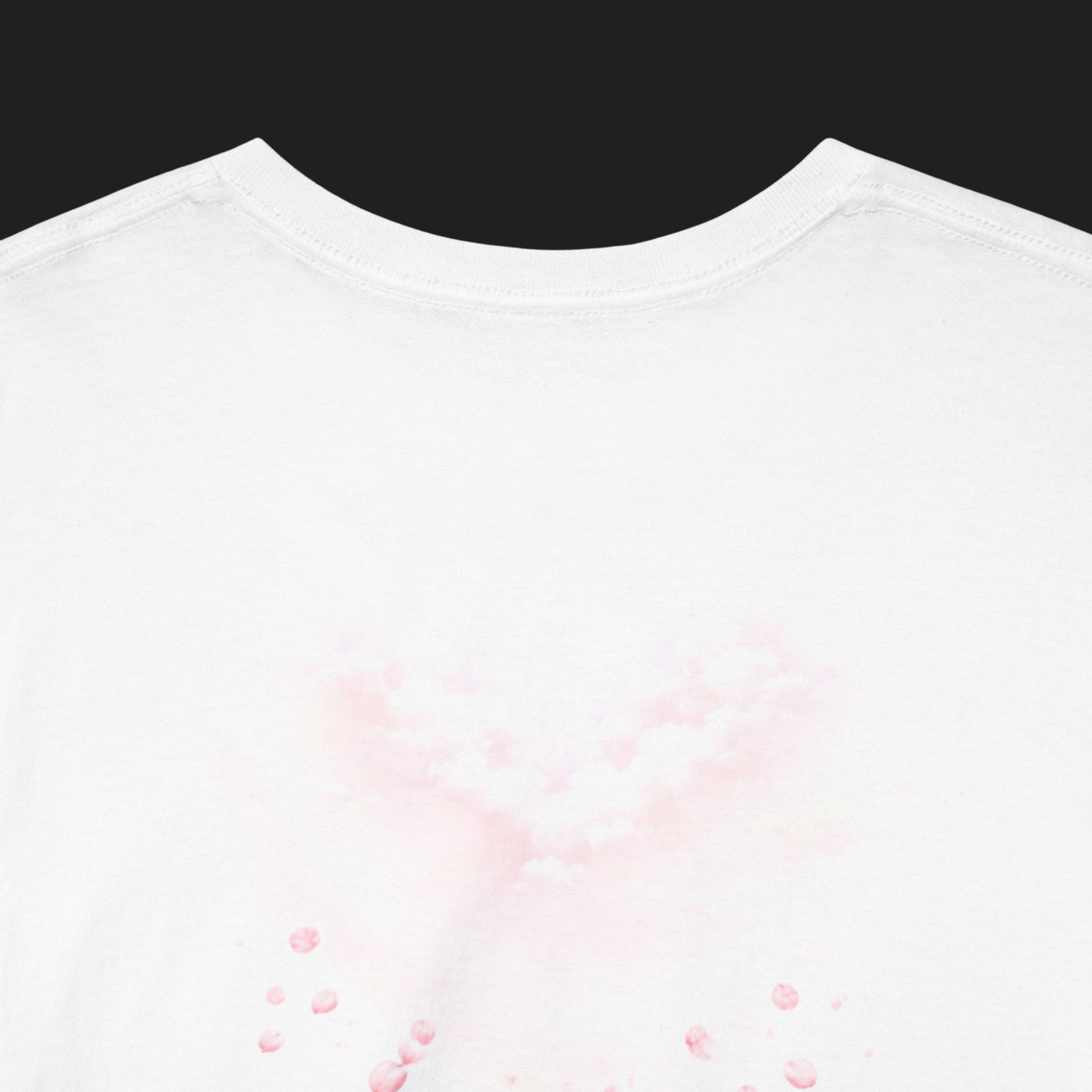 A soft, breathable tee that reads like a quiet, wearable sketch. Lightweight cotton holds delicate, faded pink artwork across the upper back — a gentle cluster of hearts that look hand-stamped and slightly worn with time. It settles easily into everyday life: pulled on after a slow morning, layered under an open shirt for a weekday errand, or worn at a low-key gathering where small, personal details matter. The shirt's relaxed cut and ribbed neckline keep the silhouette unfussy. The faint back print feels intimate rather than loud, like a secret nodded to friends who notice the little things.