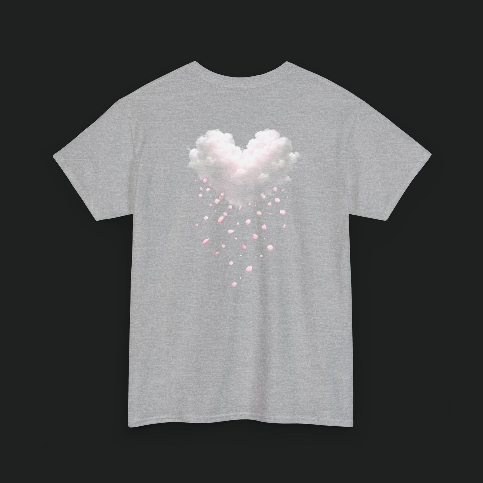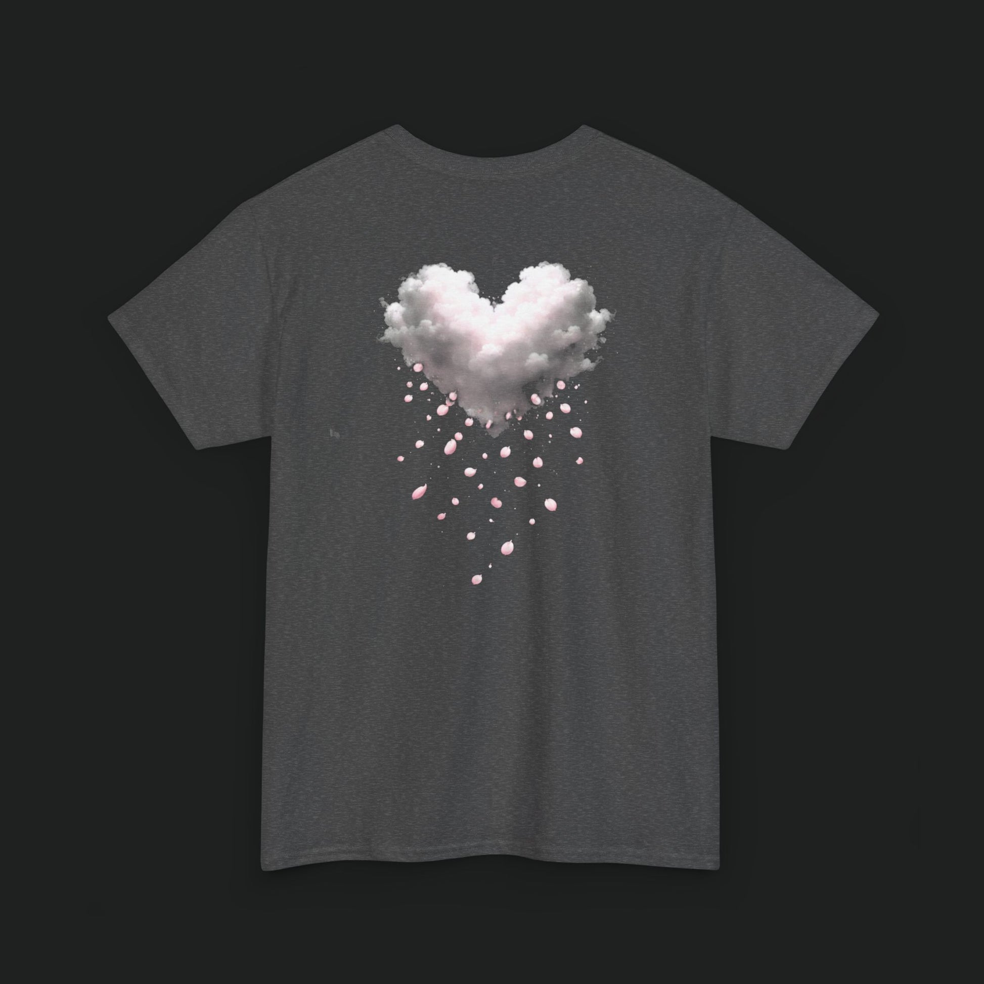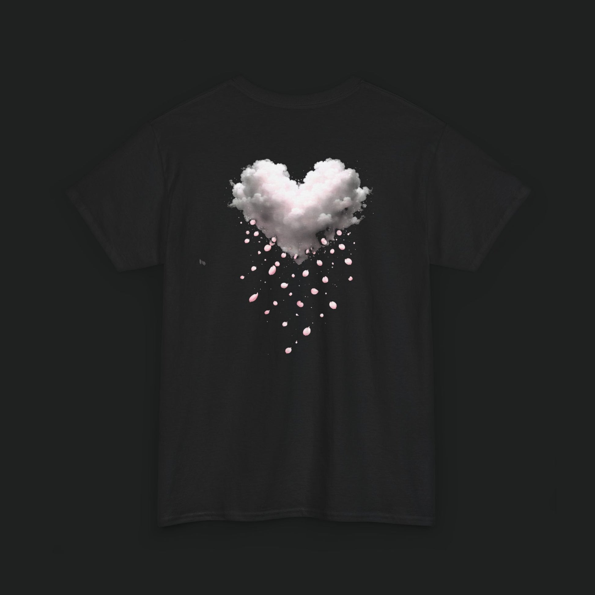 A soft, breathable tee that reads like a quiet, wearable sketch. Lightweight cotton holds delicate, faded pink artwork across the upper back — a gentle cluster of hearts that look hand-stamped and slightly worn with time. It settles easily into everyday life: pulled on after a slow morning, layered under an open shirt for a weekday errand, or worn at a low-key gathering where small, personal details matter. The shirt's relaxed cut and ribbed neckline keep the silhouette unfussy. The faint back print feels intimate rather than loud, like a secret nodded to friends who notice the little things.