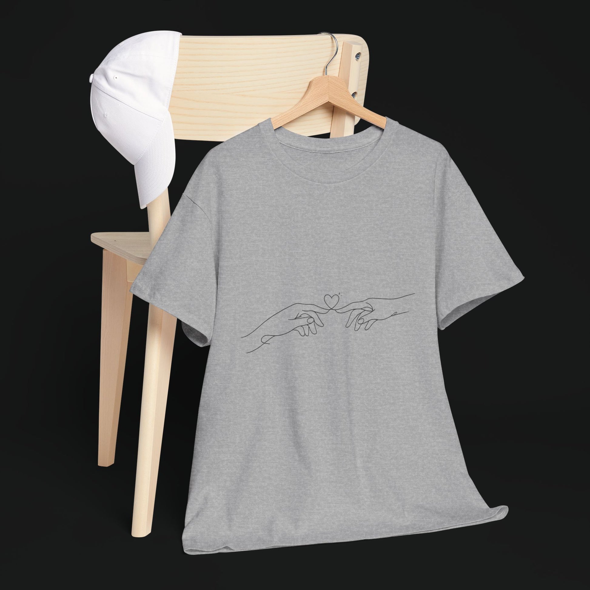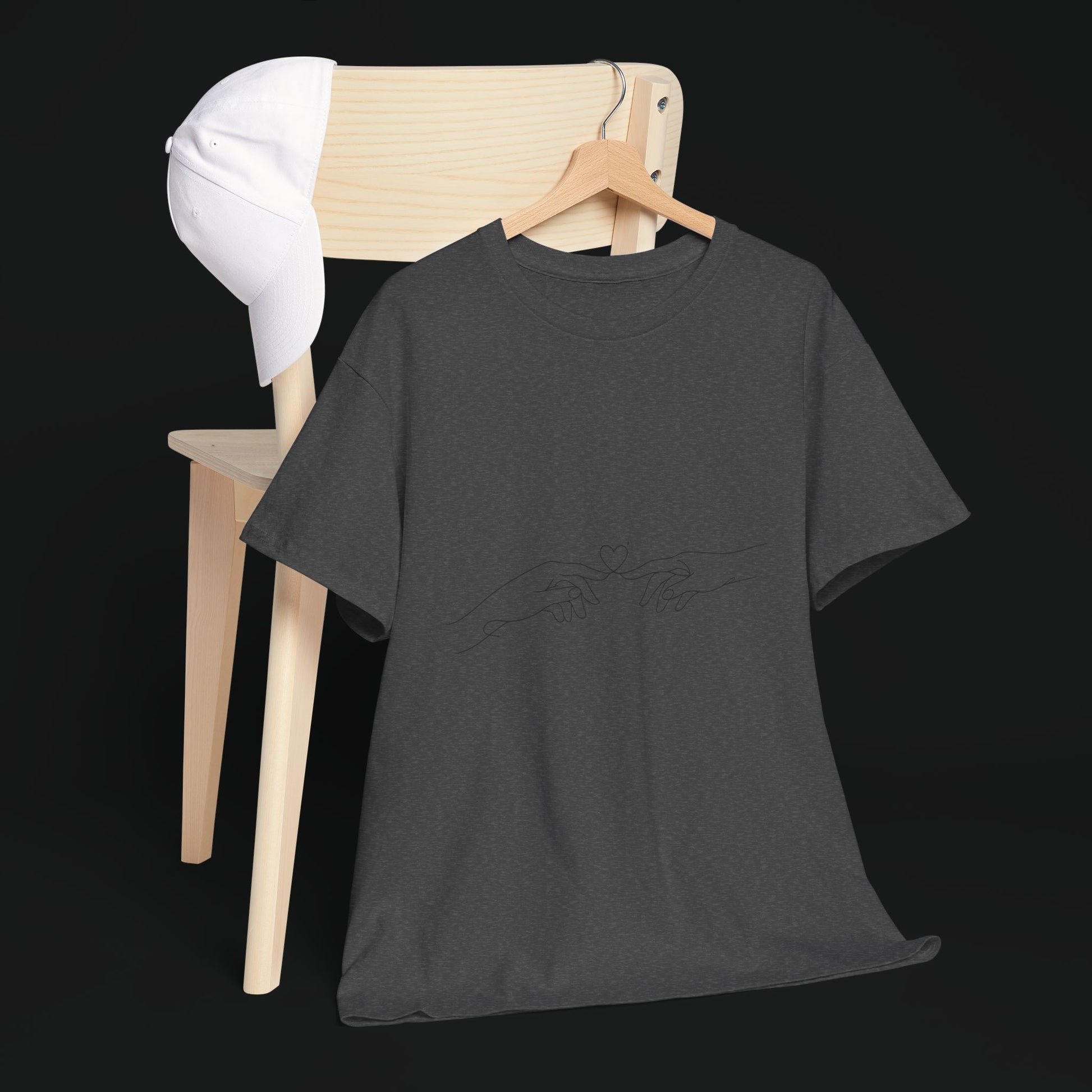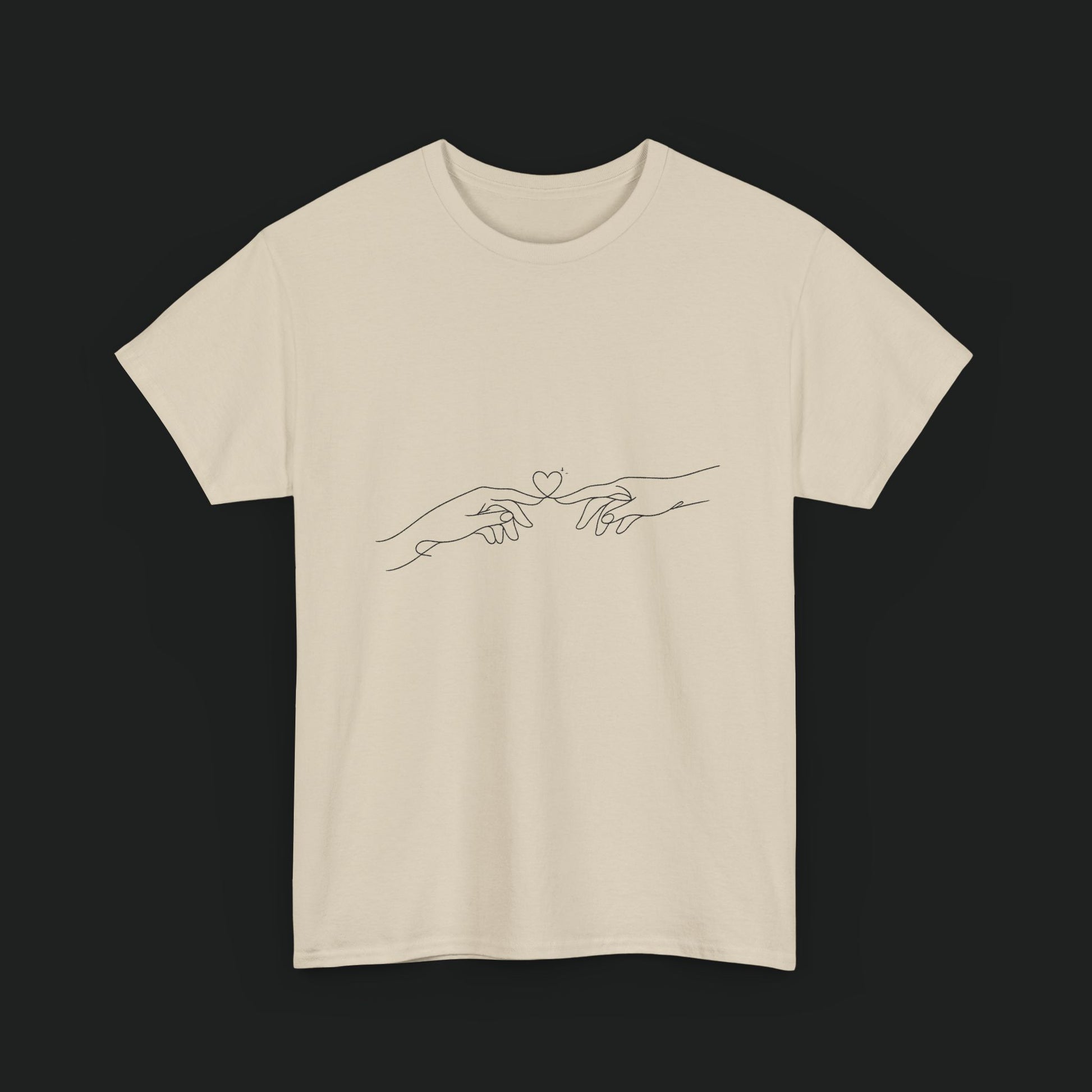 A simple, soft cotton tee that reads like a quiet conversation. The fine-line design across the chest traces two hands reaching toward each other, a minimal, intimate motif that leans into calm and connection. Lightweight yet durable, the shirt wears in, not out — the collar keeps its shape, the tubular knit gives a smooth silhouette, and a tear-away label keeps the back of your neck irritation-free. It sits relaxed on the body for everyday layering or solo wear, folding easily into routines that favor comfort and subtle storytelling. Ethically sourced cotton and careful printing deliver a crisp line illustration that feels personal rather than loud.